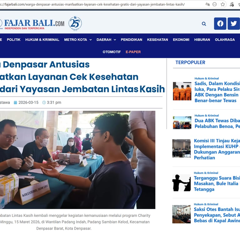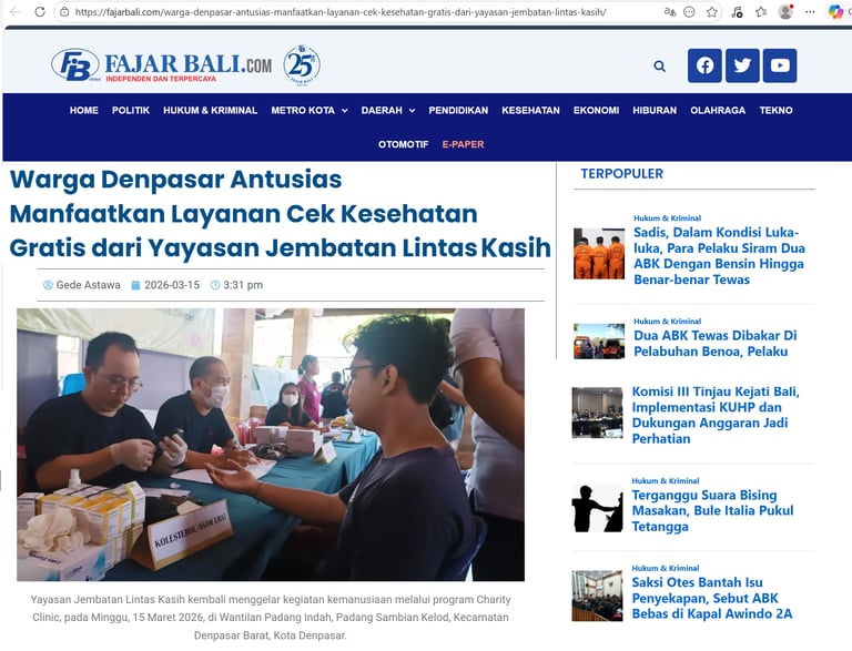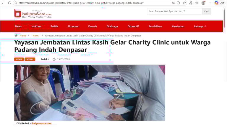 Dalam upaya meningkatkan pelayanan kesehatan bagi masyarakat, Yayasan Jembatan Lintas Kasih kembali menggelar kegiatan kemanusiaan melalui program charity clinic yang dilaksanakan pada Minggu (15/3/2026) di Wantilan Dusun Padang Indah, Desa Padangsambian, Kecamatan Denpasar Barat, Bali.