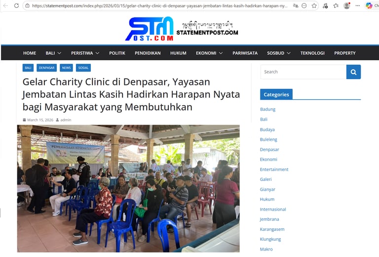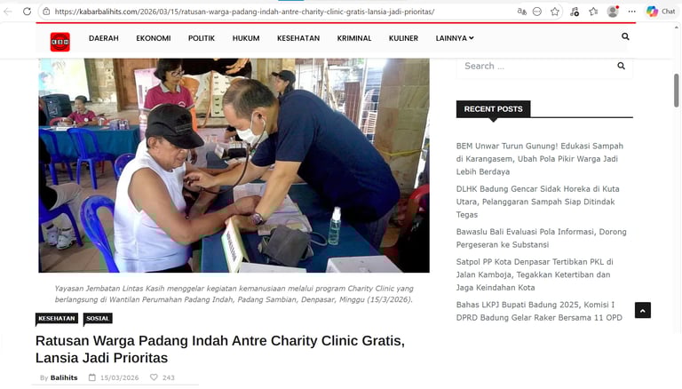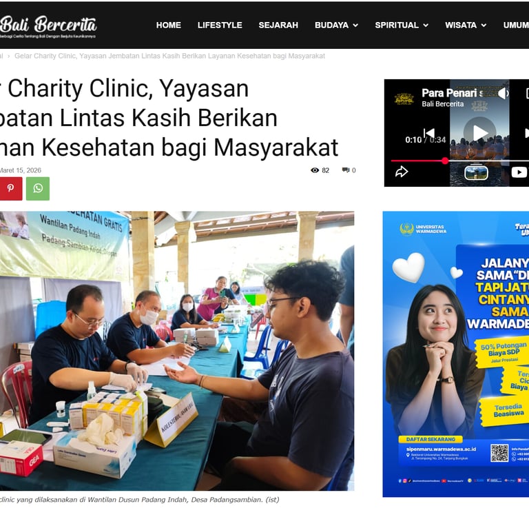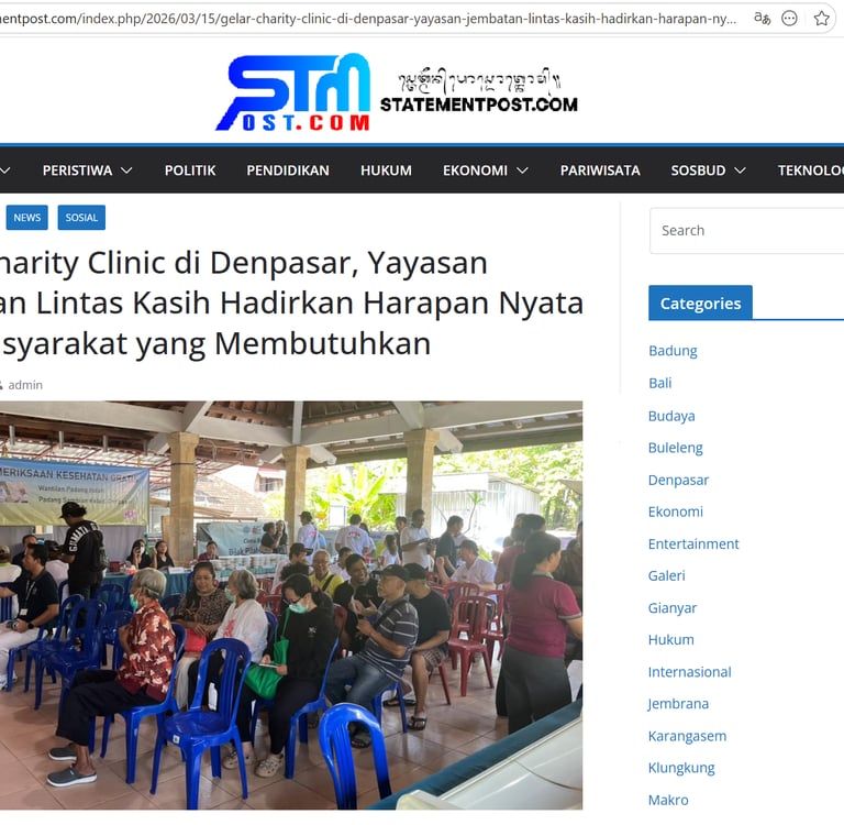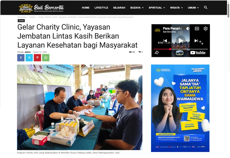 Di tengah meningkatnya kebutuhan masyarakat terhadap layanan kesehatan yang terjangkau, Yayasan Jembatan Lintas Kasih kembali menggelar kegiatan kemanusiaan melalui program Charity Clinic, pada Minggu, 15 Maret 2026, di Wantilan Padang Indah, Padang Sambian Kelod, Denpasar.