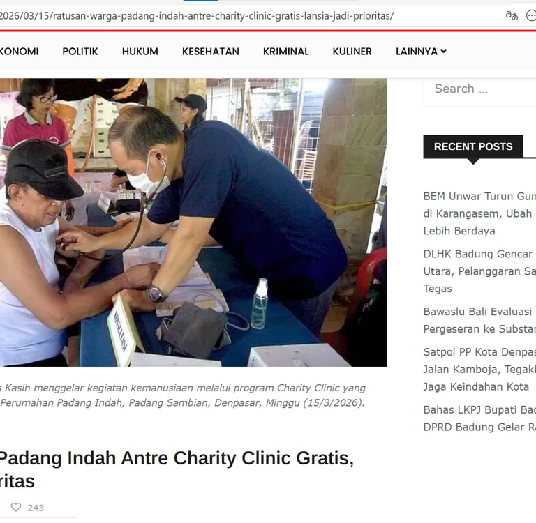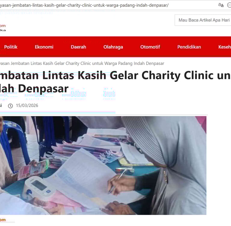 Di tengah meningkatnya kebutuhan masyarakat terhadap layanan kesehatan yang terjangkau, Yayasan Jembatan Lintas Kasih menggelar kegiatan kemanusiaan melalui program Charity Clinic yang berlangsung Minggu (15/3/2026). di Wantilan Dusun Padang Indah, Desa Padangsambian, Kecamatan Denpasar Barat, Bali.